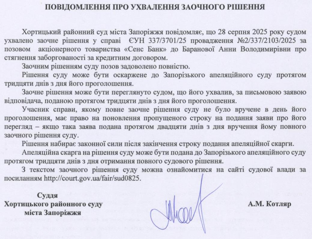 Повідомлення про ухвалення заочного рішення у справі №337/3701/25 за позовом АТ "Сенс Банк" до Баранової Анни Володимирівни