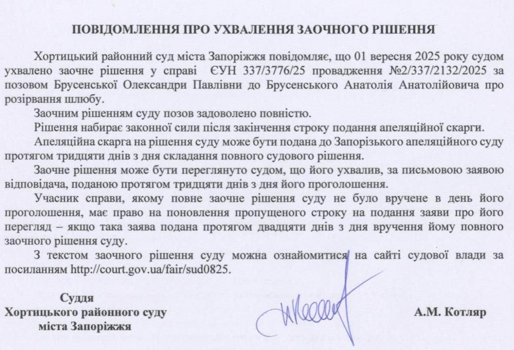Повідомлення про ухвалення заочного рішення у справі №337/3776/25 за позовом Бруснецької О.П до Бруснецького А.А.